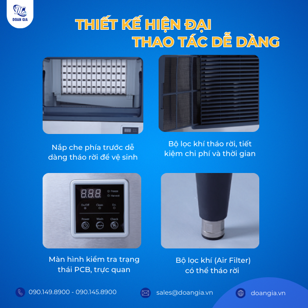 Máy làm đá được thiết kế hiện đại, nắp che phía trước, bộ lọc khí (Air Filter) có thể tháo rời để vệ sinh, tăng tuổi thọ và đảm bảo hiệu suất hoạt động, giảm chi phí và tiết kiệm thời gian bảo dưỡng.