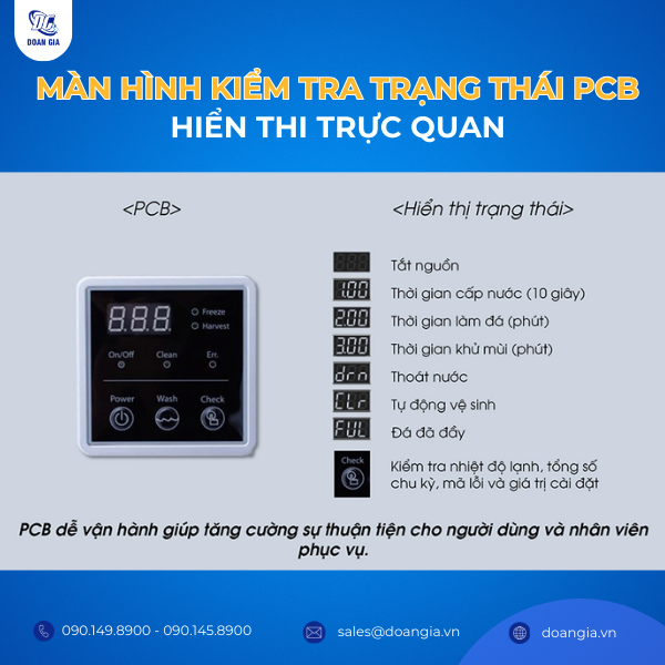 Máy làm đá LASSELE LMI-500A + LB-300S được trang bị màn hình kiểm tra trạng thái PCB, một tính năng mang lại nhiều ưu điểm vượt trội trong việc giám sát hoạt động của máy làm đá. Màn hình này giúp người sử dụng dễ dàng theo dõi các thông số quan trọng của máy như thời gian, trạng thái hoạt động và các lỗi kỹ thuật nếu có. Điều này giúp phát hiện và xử lý sự cố một cách nhanh chóng, giảm thiểu thời gian gián đoạn trong quá trình sản xuất đá.
